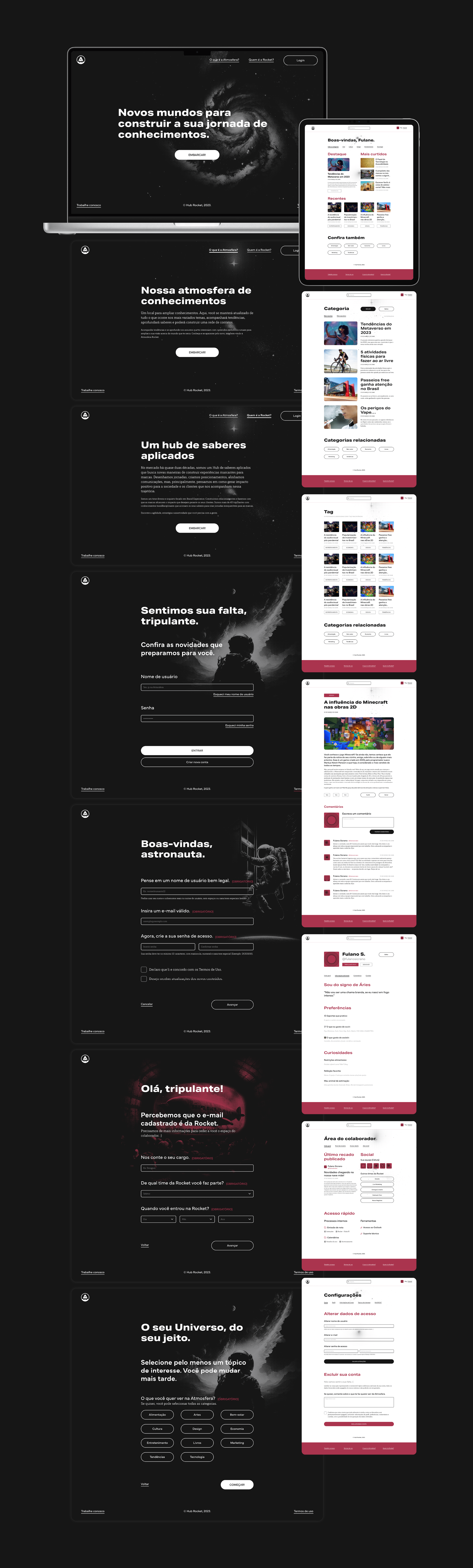 The design was based on Rocket's website, with adaptations inspired by blogging platforms. The visual aspect is predominantly minimalist and focused on text content. To set up the interface, the 8pt grid method was used, while the components were created using the Atomic Design methodology.
