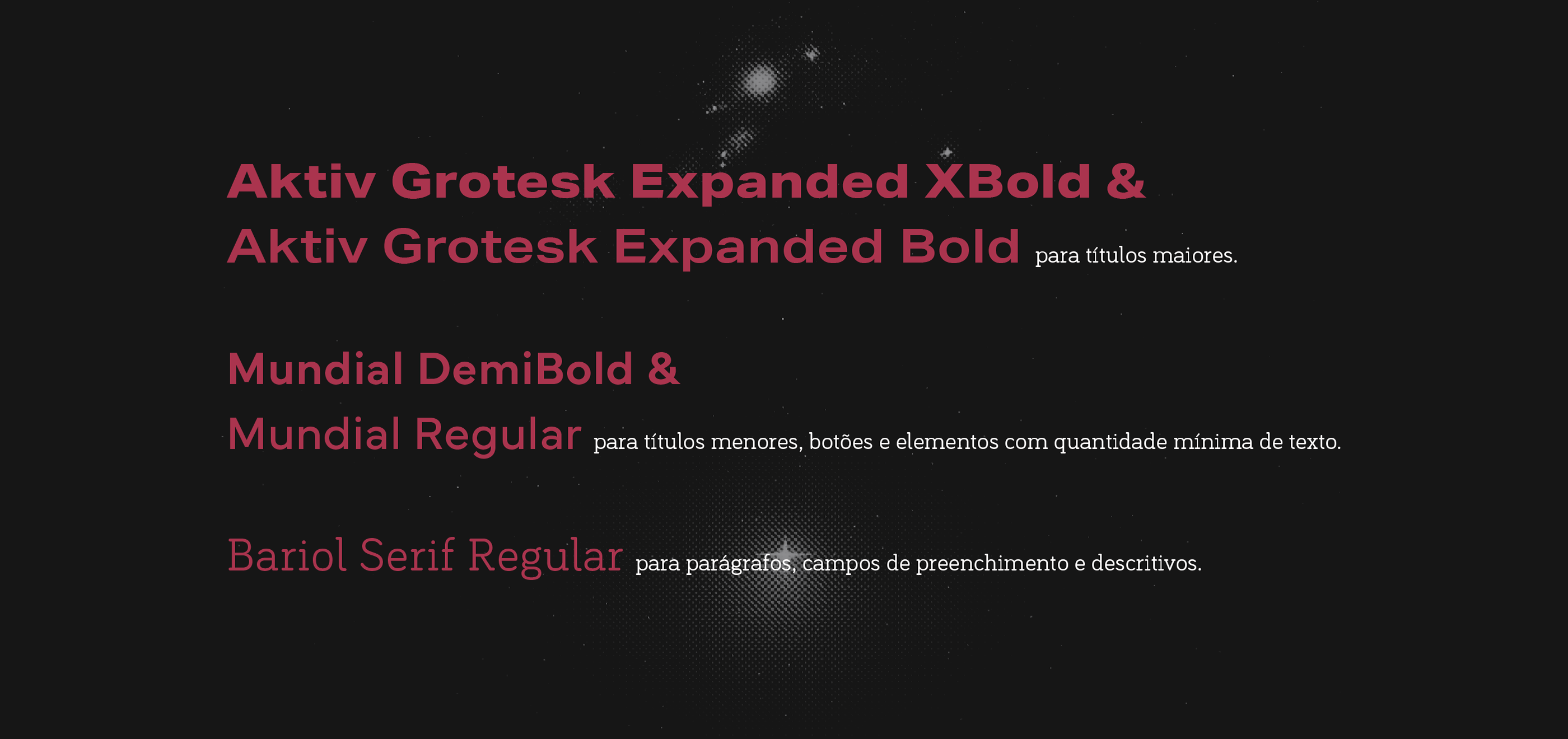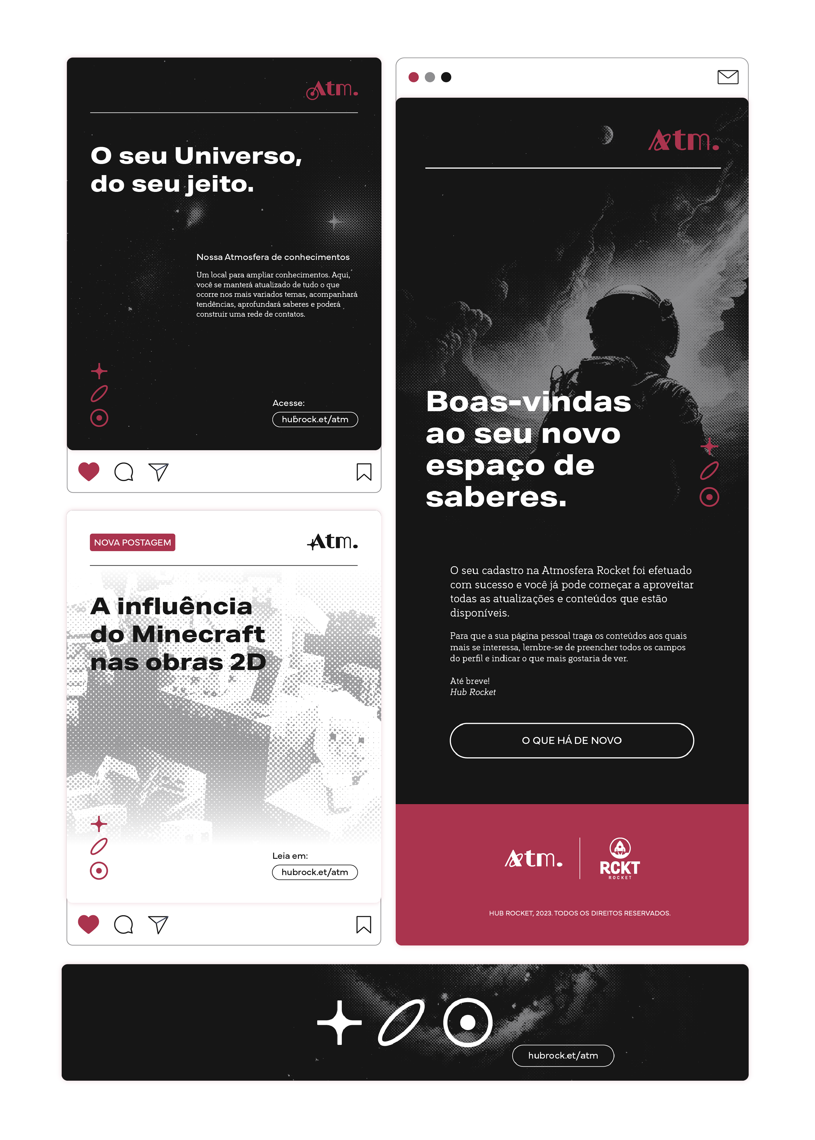 The typographic family and color palette considers the platform's personality and legibility, along with Hub Rocket's institutional design. The background images bring immersion to the spatial concept, with halftone textures that gives personality to the website and avoids conflicts between the background and the content. The identity icons represent, respectively, a star, a galaxy, and the atmosphere itself, and they can be used as graphics.