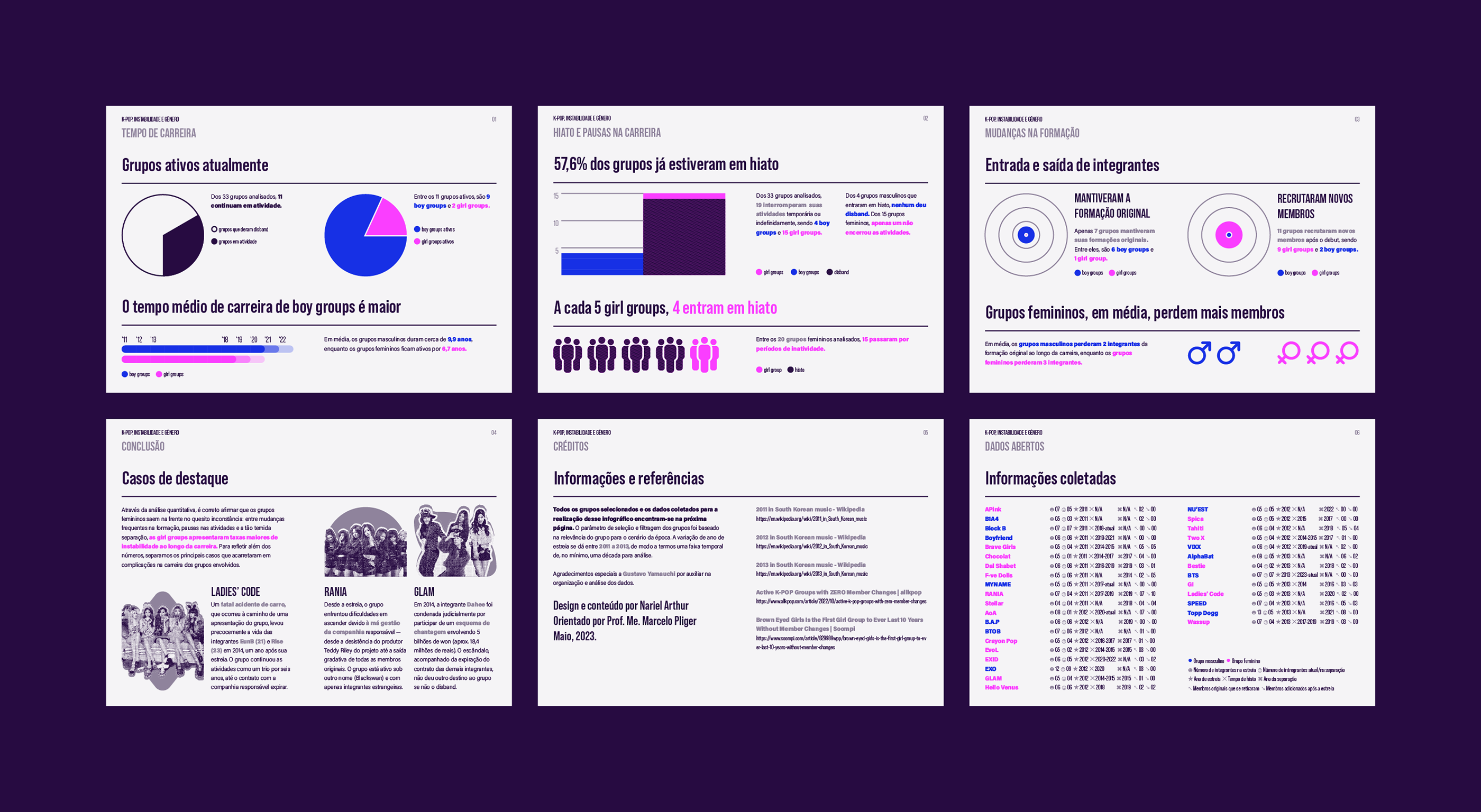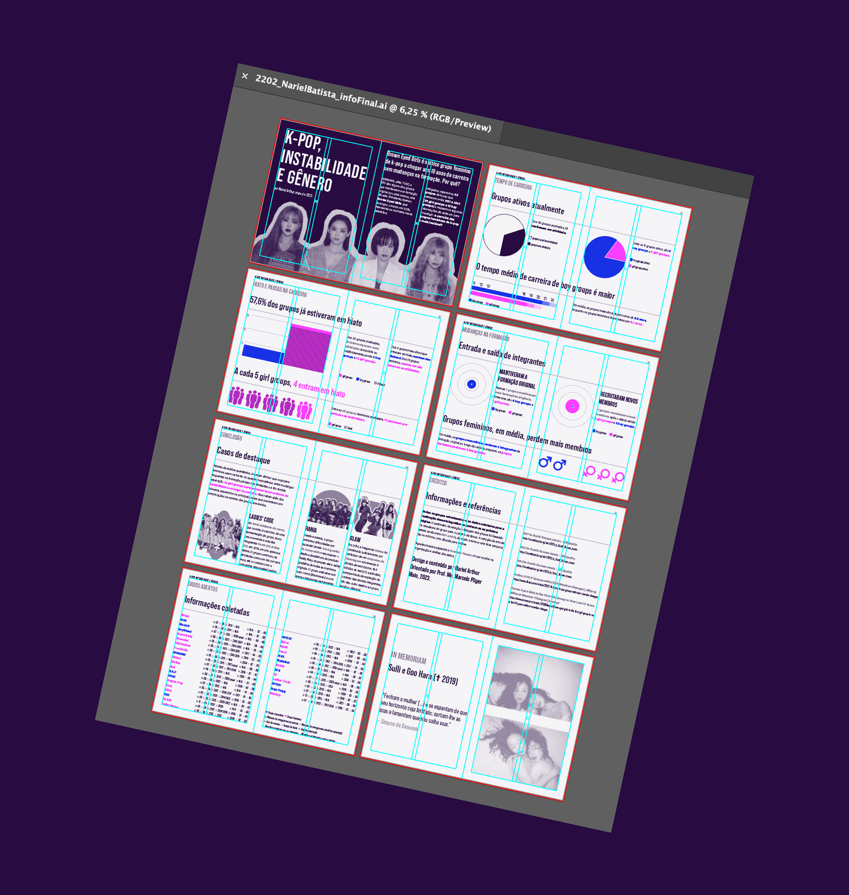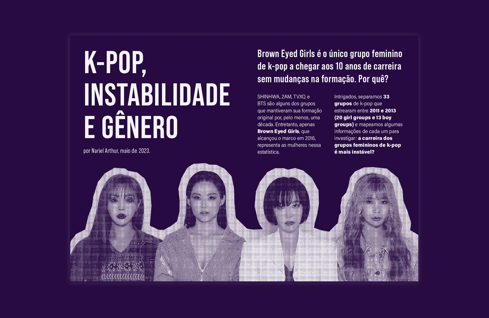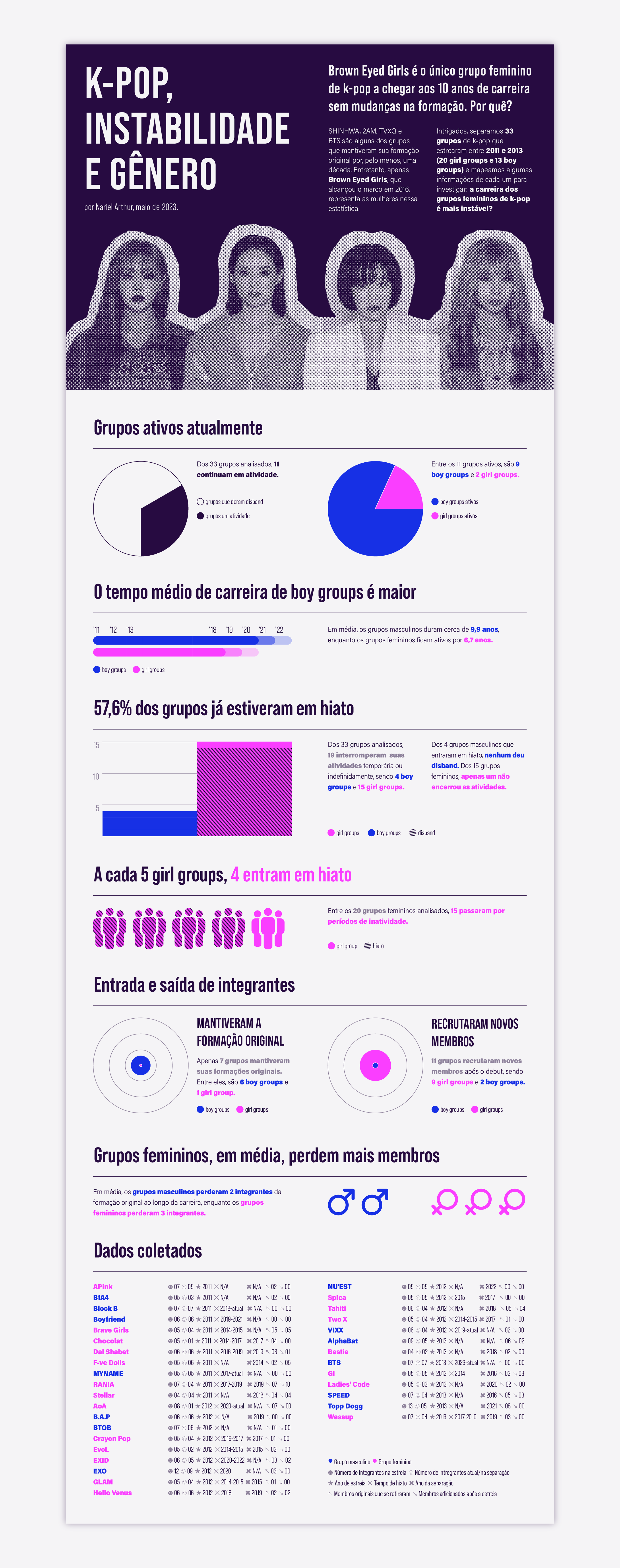 🇧🇷 Trabalho acadêmico de infografia que investiga a relação entre grupos femininos e inconstâncias ao longo da carreira. Foram coletados dados acerca do tempo de vida, rotatividade de membros e pausas de 33 grupos que debutaram entre 2011 e 2013.