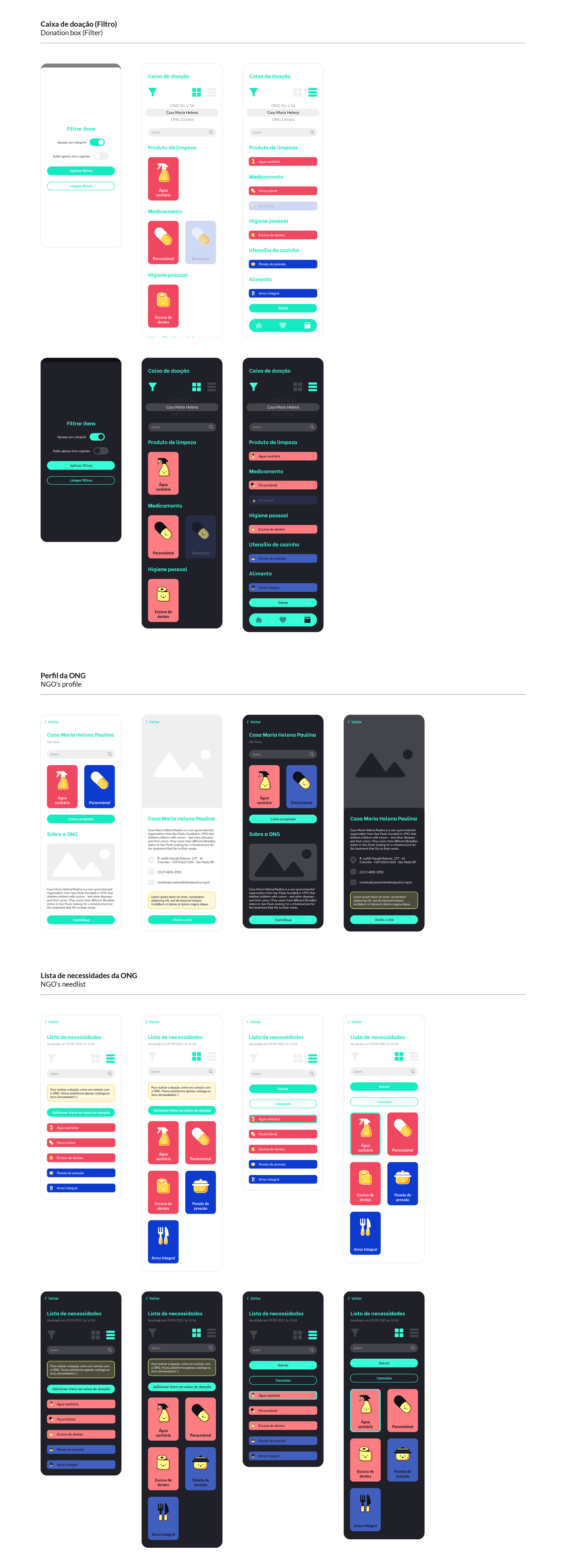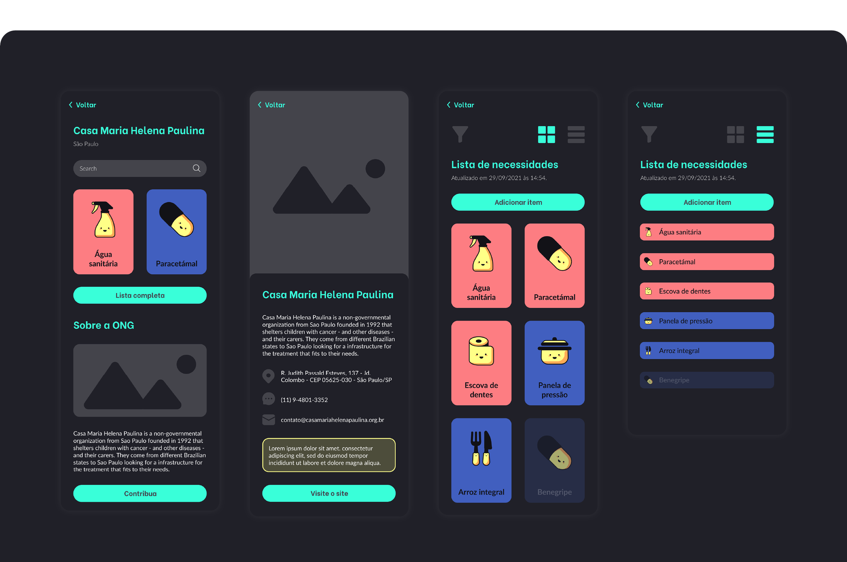 The app aims to help NGOs to manage their donations while also connecting the donors to the organizations by giving them access to an updated list of supplies it needs. relpi para ONGs (relpi for NGOs) is the app for NGOs registration, in which it is possible to manage items and add information about the organization and relpi is the app for donors, in which the user can favorite organizations and save items to create a shopping list.