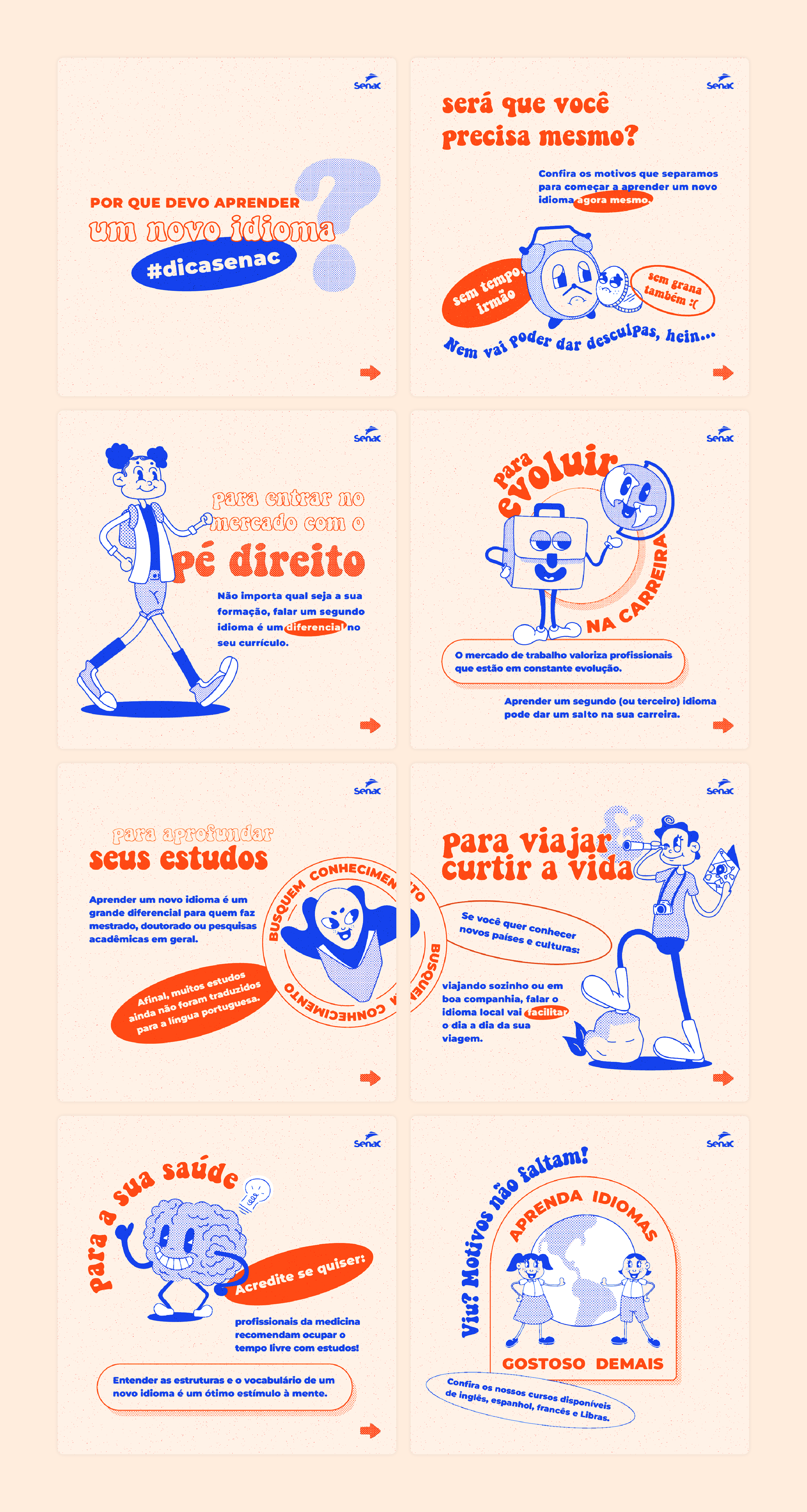 The intention was to communicate with dynamism and informality, using elements that are known by internet users and draw attention to the courses in a playful way, therefore the arts were created with Brazilian pop culture references, such as memes and vernacular art, and retro stylization through risograph effect and rubber hose illustrations.