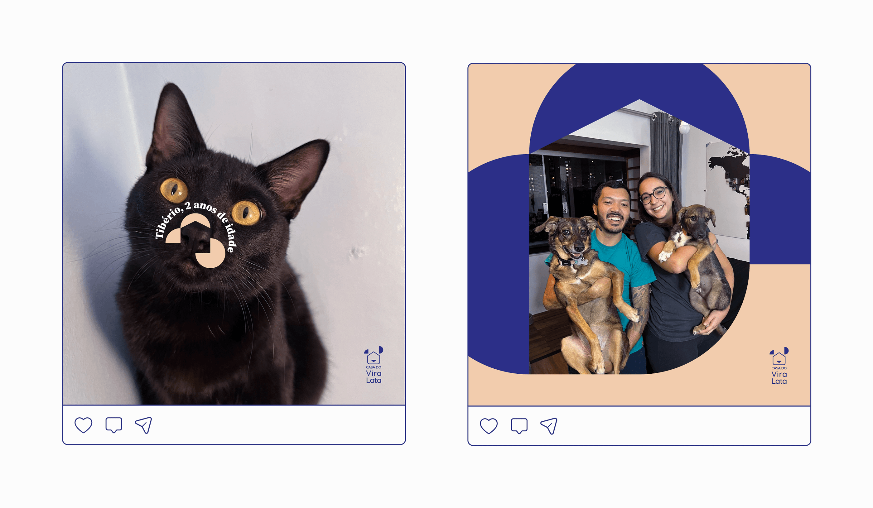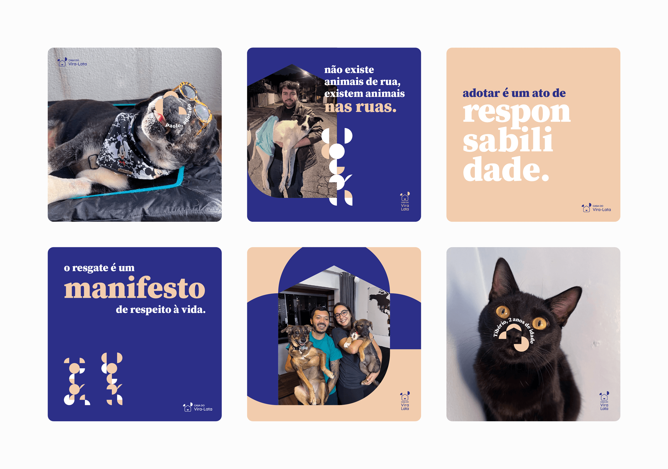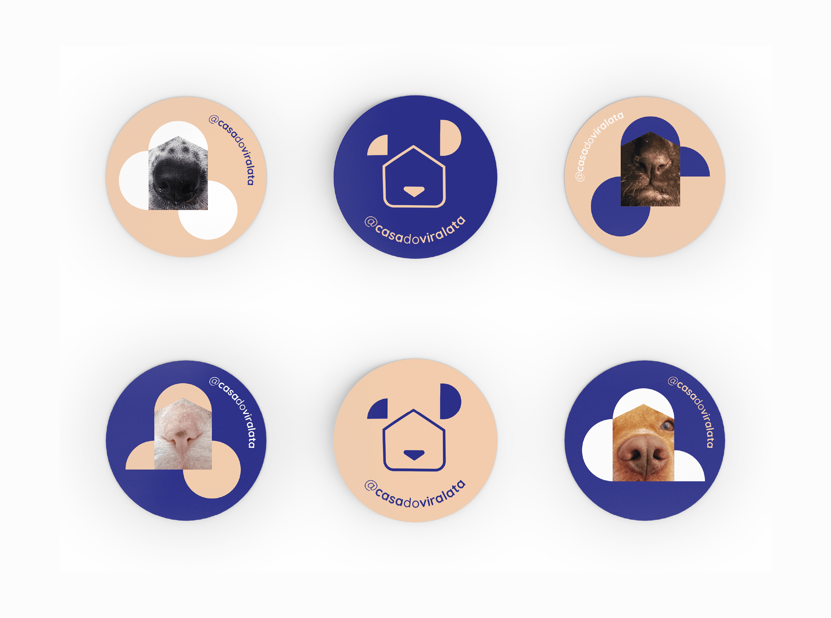 For the proposed visual identity, it was selected three essential concepts according to the project's values: support, responsibility and family, which influenced all visual elements. The logotype contains the symbols: house (representing home, protection and safety), ears (the left one represents cat ears and the right one represents dog ears), and the snout (which is considered the "fingerprint" of cats and dogs). Through geometric shapes with round corners, chosen colors and typography, the brand created for Casa do Vira-Lata successfully communicates its values and premises and helps the NGO's positioning and awareness.