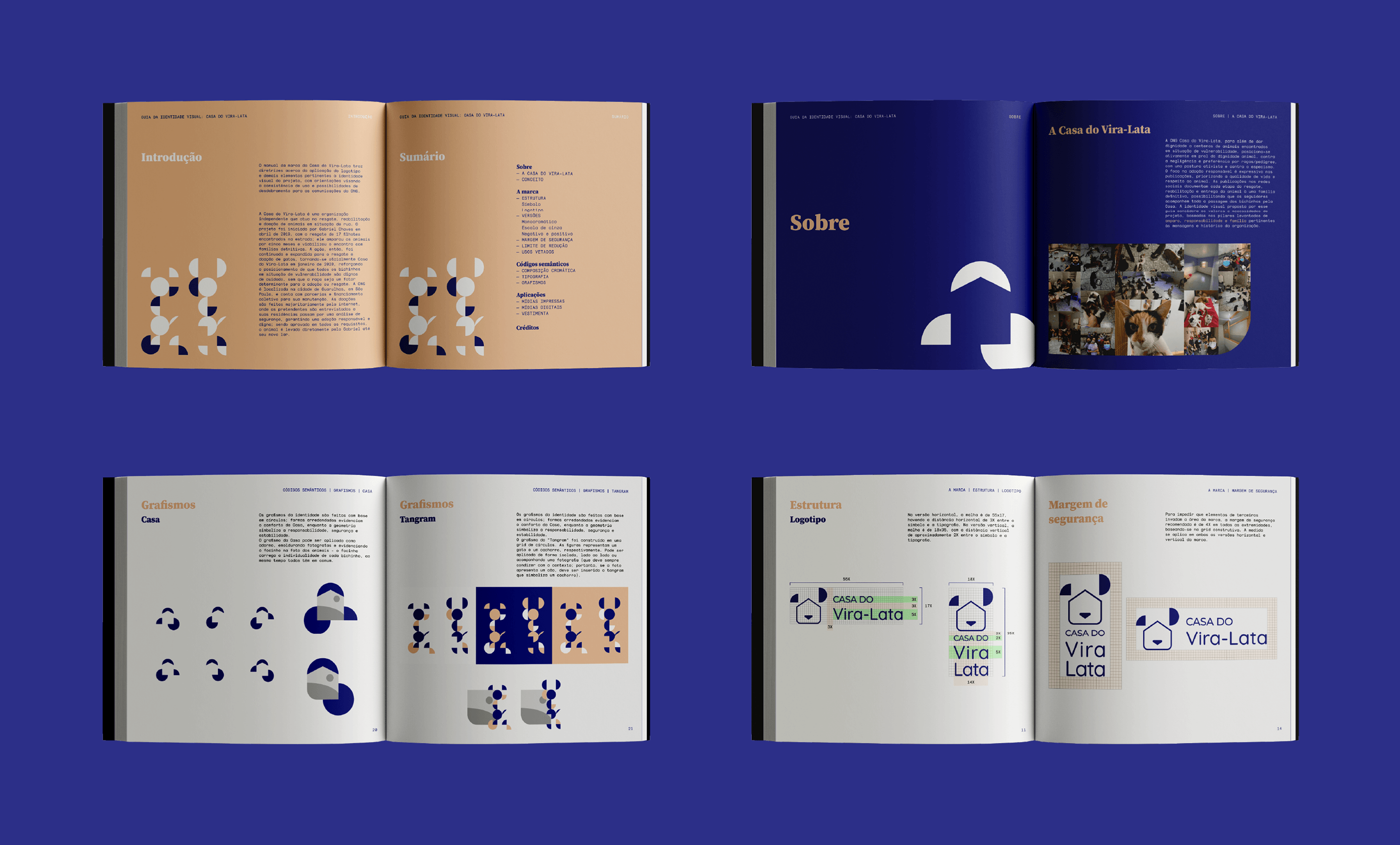Para a identidade visual proposta, foram elencados três pilares essenciais alinhados aos valores do projeto, sendo estes: amparo, responsabilidade e família, que permeiam todos os códigos visuais definidos. O logotipo conta com os símbolos casa (representando o lar, proteção e segurança), orelhas (sendo a esquerda a orelha felina e a direita, a canina) e o focinho (que é considerado a impressão digital dos animais). Através de formas geométricas arredondadas, das cores e tipografias escolhidas, a marca construída para a Casa do Vira-Lata comunica suas premissas e valores, auxilia no posicionamento e reconhecimento da ONG.